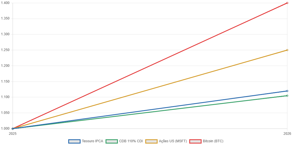 Simulação feita com base em ativos reais: Tesouro IPCA, CDB 110% CDI, Ações US (MSFT), Bitcoin (BTC).